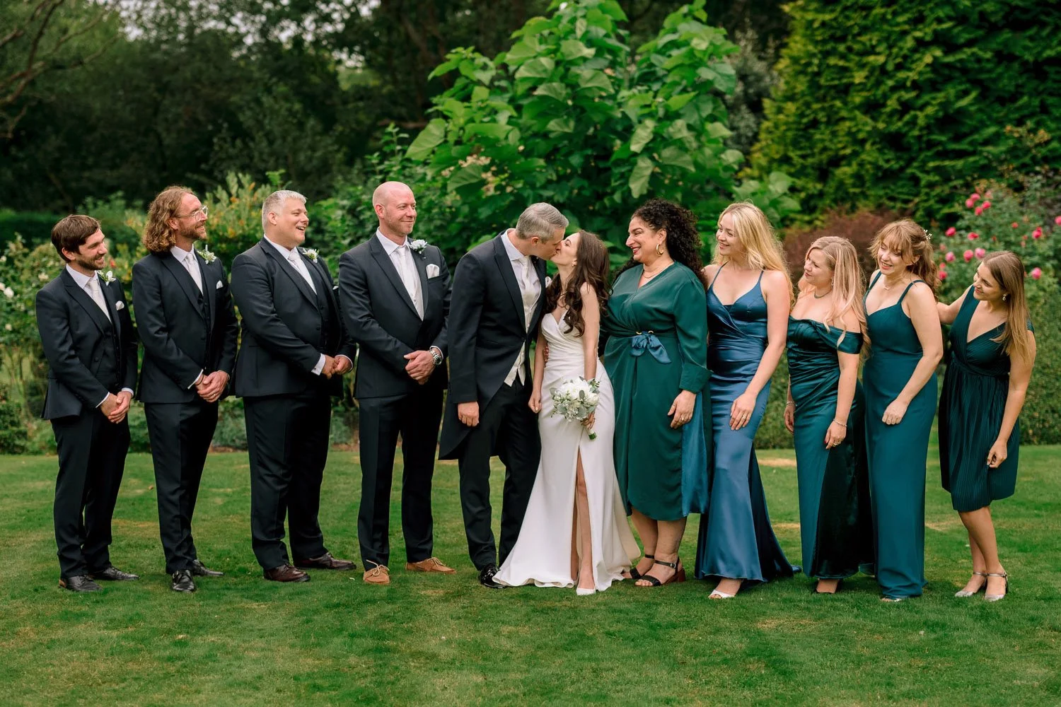 Bridesmaids and Groomsmen in a nice straight line at Hutton Hall in Essex